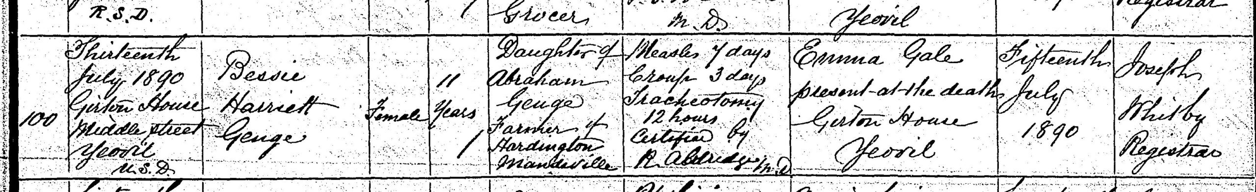 Abraham’s only daughter, Bessie Harriett, was born on 10 April 1879.[21] He paid for her to attend a school for young ladies in Yeovil called Girton House. On 6 July 1890, she contracted measles, which led to croup four days later. Her airways became so constricted that Dr Aldridge considered it necessary to perform a tracheotomy—a surgical procedure where a hole is made in the neck to access the windpipe. Tragically, she passed away twelve hours later on July 13, at the age of just eleven.[22]