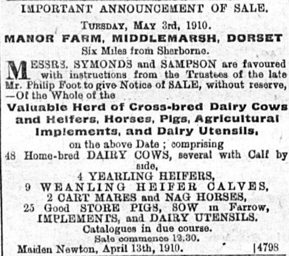 Philip died at Manor Farm on 25 March 1910 at the age of 77, leaving an estate valued at £4,855 16s 9d. After bequeathing legacies of £300 each to his daughters Lily and Adelaide, and gifting various personal belongings, he divided his estate among his eight surviving children. Among his treasured possessions were a piano, a music stool, a piece of plate presented by members of the Middlemarsh Cricket Club, and a silver teapot presented to him as a prize for the best hound puppy. He deducted sums already advanced from the shares of four of his children: £200 each from Nelson and Rebecca, and £150 each from Percival and Stanley. His sale on 3 May 1910 included 48 home-bred dairy cows, 4 heifers, 9 calves, 2 cart horses, 25 store pigs, implements and dairy utensils.[xxiii]