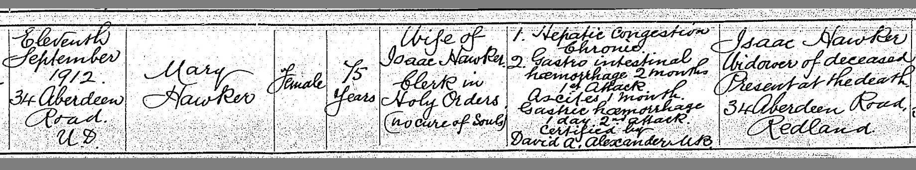 Mary Hawker's death certificate.