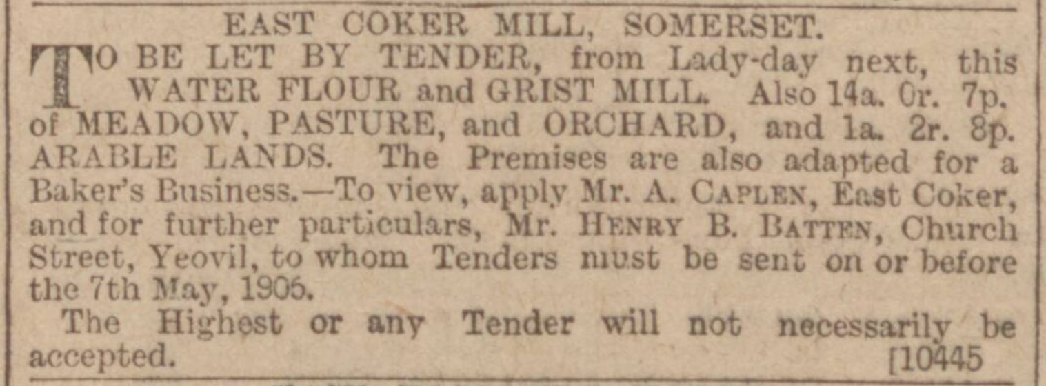In 1887, Jabez assumed the tenancy of East Coker Mill, which included 14 acres of farmland.[18] He continued his bakery business, while also grinding corn and barley and keeping a few cows.[19] The land included orchards from which he made cider.[20]