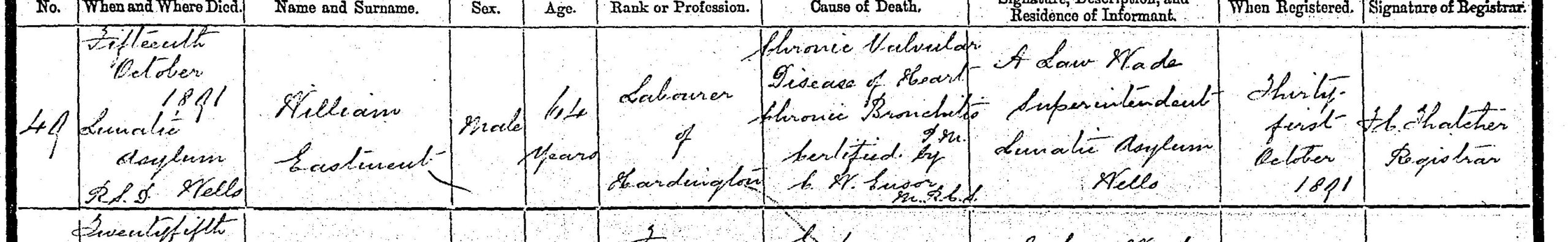 Circa 1824- William (married Elizabeth Gillingham at North Perrott in 1844; resided at Hardington where he worked as a farm labourer and, for a brief time, a railway labourer; admitted to Wells asylum in 1884; died in 1891 from heart disease and bronchitis);[4]