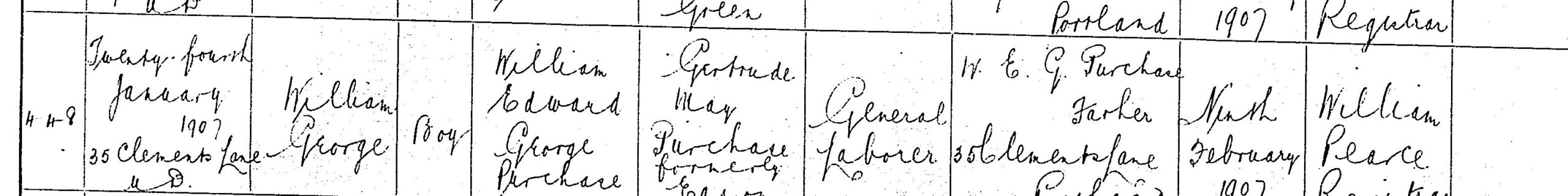 Gertrude gave birth to her first child, William George, at 35 Clements Lane, Portland, on 24 January 1907.[6] At that time, William was employed as a general labourer.